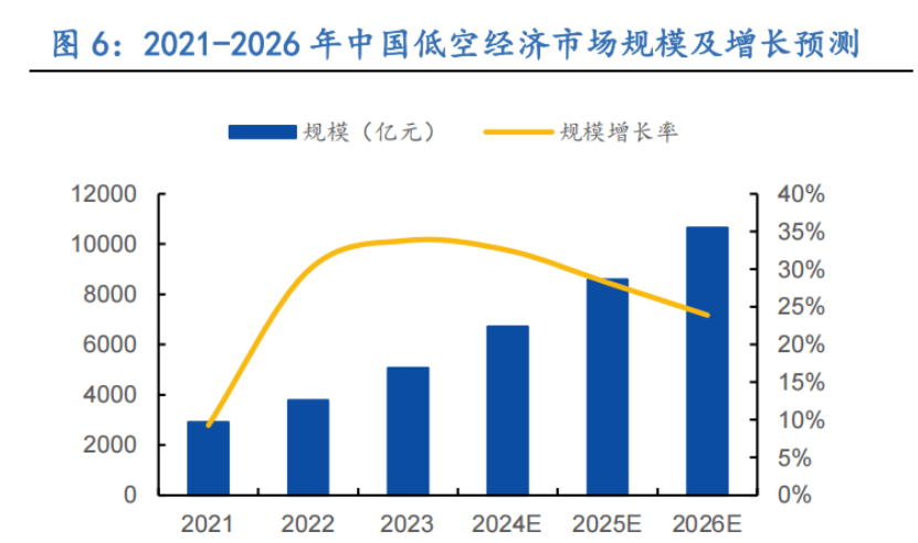 低空经济作为新兴融合经济形态,产业辐射面广,市场空间广阔,未来会成长为万亿规模。根据赛迪智库,2023年中国低空经济规模达5059.5亿元,增速33.8%。随着低空飞行活动增加和基础设施投资见效,未来几年将保持快速增长,预计2026年规模突破万亿元,达10644.6亿元。