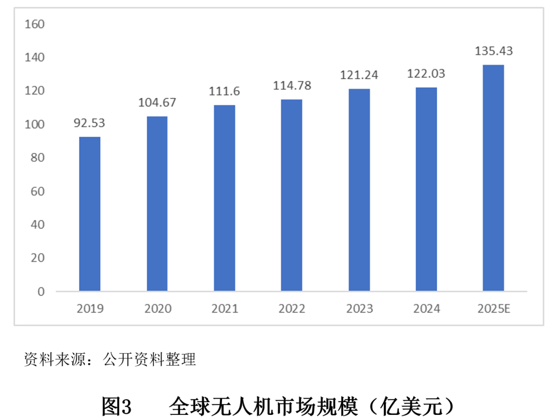 2024年全球无人机市场规模达122.03亿美元,较2023年的121.24亿美元略增0.79亿美元,同比增长约0.65%,增速显著放缓。这表明全球无人机市场正从早期的高速扩张阶段,逐步转向成熟期的结构性调整。预计2025年全球军用无人机市场规模将达到135.43亿美元。