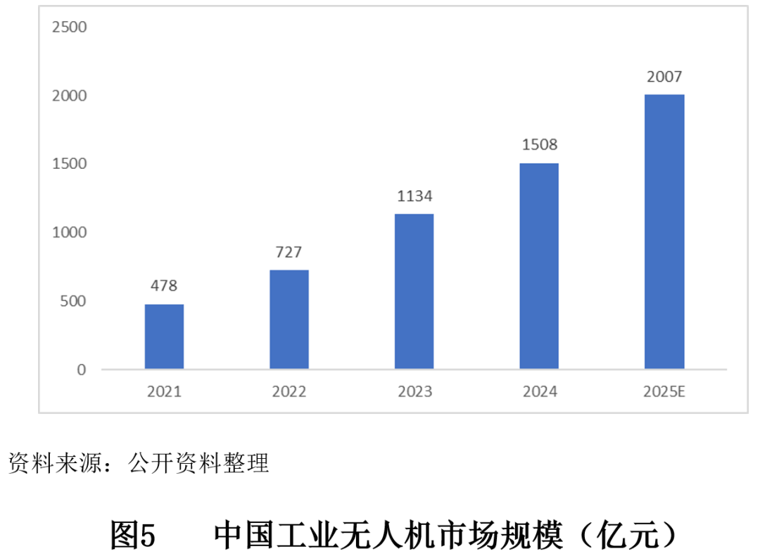 2024年中国工业无人机市场规模达1508亿元,较2023年的1134亿元增长374亿元,同比增长约33%。在低空经济加快布局和产业智能化转型驱动下,工业无人机在能源巡检、农业植保、应急救援、城市管理等场景中的应用持续深化,成为推动无人机市场扩容的核心引擎。伴随政策利好叠加、产品性能提升和行业标准逐步完善,2024年中国工业无人机市场进入快速发展阶段,规模与技术双轮驱动特征日益凸显。预计2025年中国民用无人机市场规模将达到1691亿元。