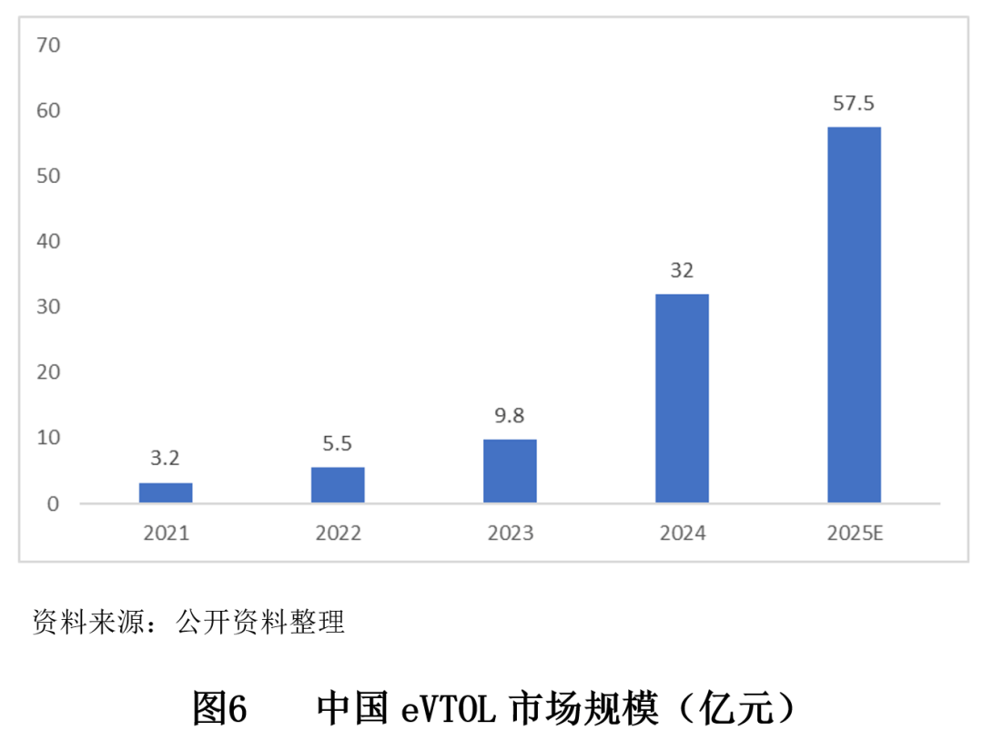 2024年中国eVTOL市场规模达到32亿元,较2023年的9.8亿元大幅增长226.5%,显示出爆发式扩张态势。在低空空域逐步开放、政策扶持持续加码、核心技术不断成熟的背景下,eVTOL作为未来城市空中出行的重要载体,正在加速迈入商业化初期阶段。预计2025年中国eVTOL市场规模将增至57.5亿元。