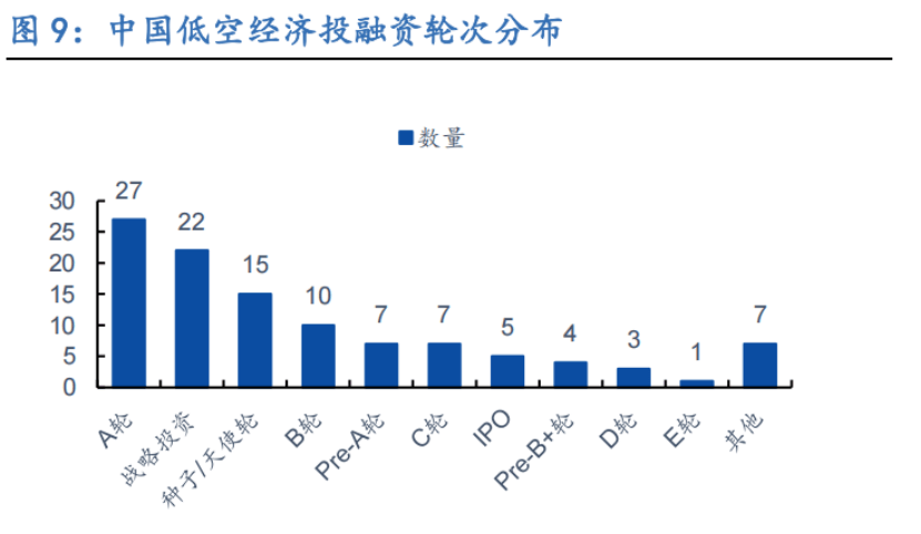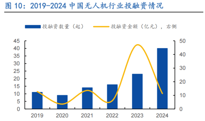 2019-2024年,共113起投融资事件,总投融资金额94.37亿元,涵盖整机、系统及零部件制造等环节;2024年投融资事件活跃,但投融资金额较小。这主要与投融资轮次分布有关,2024年40起投融资事件中16起天使轮融资,天使轮投融资金额相对于其他中后期轮次融资金额较小;投融资事件中天使轮和A轮占比较大,投融资事件较多,分别达到31起和26起。无人机行业,大疆创新已经占据大部分市场份额并形成技术壁垒。初创企业很难与大疆展开竞争,只能另辟蹊径,从一些大疆尚未深入涉足细分领域切入。这些细分领域的初创企业在起步阶段多处于天使轮融资阶段。这使得行业内天使轮和A轮投融资事件较多。