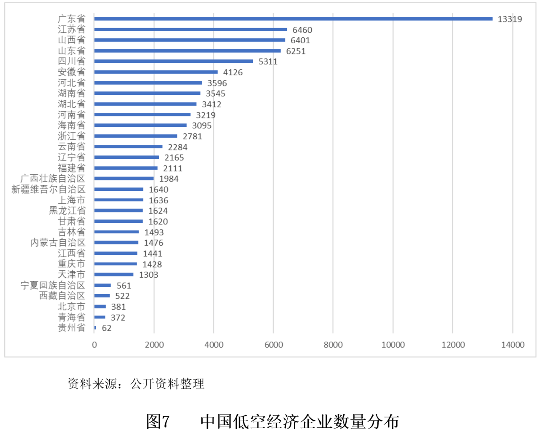 我国低空经济形成“东部引领、中部跃升、西部筑基”的三维梯度格局。根据国家统计局的地区划分标准,东部10个省份低空经济企业总量达44433家,在全国占比接近半数(49.86%),在企业数量排名前十的省份中,东部地区占据五席(广东、江苏、山东、北京、河北),其中,广东、江苏、山东组成“黄金三角”,合计占比29.21%;安徽、湖南、湖北三个中部省份分列第6、9和第10位,共同打造中部地区低空经济增长极。
