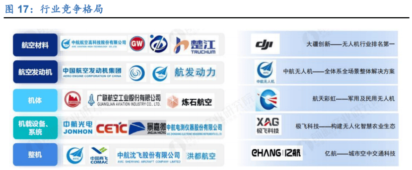 中国低空经济行业竞争格局鲜明且发展态势良好。通用航空是低空经济的主体产业,无人机是低空经济的主导产业。1)通用航空领域:由航空领域的国有大型企业集团主导,历经数次战略性和专业化重组,形成中国航空工业集团、中国航发、中国商飞以及中外合资企业为主,众多原材料和零部件配套供应商为辅的企业格局;2)无人机领域:从市场排名来看,大疆创新是中国无人机行业排名第一的公司,其次中航无人机、航天彩虹。其中,中航无人机、航天彩虹均为军用无人机行业龙头,但近年来民用无人机快速发展,未来,民用无人机或将占据市场主导。