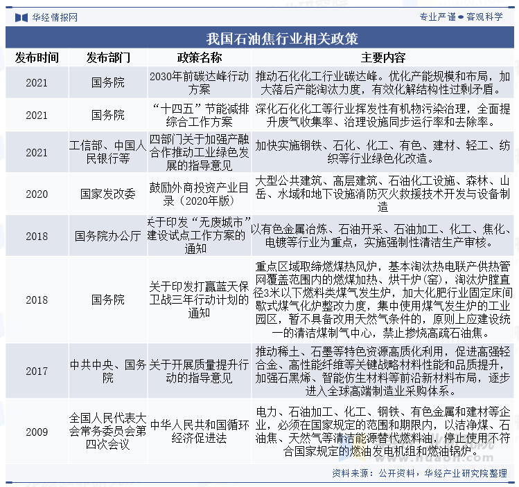 近些年来,为了促进石油焦行业的健康发展,我国政府部门发布了《中华人民共和国循环经济促进法》、《关于印发打赢蓝天保卫战三年行动计划的通知》、《关于印发“无废城市”建设试点工作方案的通知》等政策。